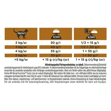 Ved fodring med både tør- og vådfoder reduceres mængden af tørfoder med 20g for hver 1/3 dåse Feline NF Advanced Care Can, der tilføjes.