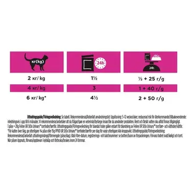 Se tabel. Anbefalet anvendelsestid til: opløsning: 5-12 uger; reducering af tilbagevenden: indledningsvist op til 6 mdr. Det anbefales, at man får en dyrlæges vurdering før brug, og før anvendelsestiden forlænges. Rent og frisk vand bør altid være tilgængeligt. 1 pose = 20g Feline UR StOx Urinary™ Tørfoder. Blandet fodervejledning er kun underbygget for blanding af Feline UR StOx Urinary™ tør- og vådfoder. *Til katte over 6kg, tilsæt 3/4 pose eller 15g PPVD UR StOx Urinary™ tørfoder dagligt pr. ekstra kg kropsvægt.