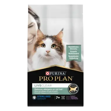 PRO PLAN® LiveClear Senior 7+ med kalkun er udviklet specielt til ældre katte og tager højde for deres ændrede behov med alderen. Foderet er rigt på kalkun, har et højt proteinindhold og et lavt kulhydratindhold, hvilket gør det nemmere for din senior kat at holde idealvægten.